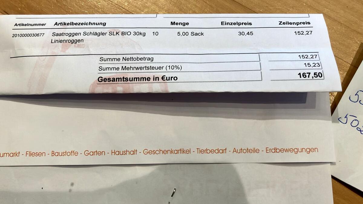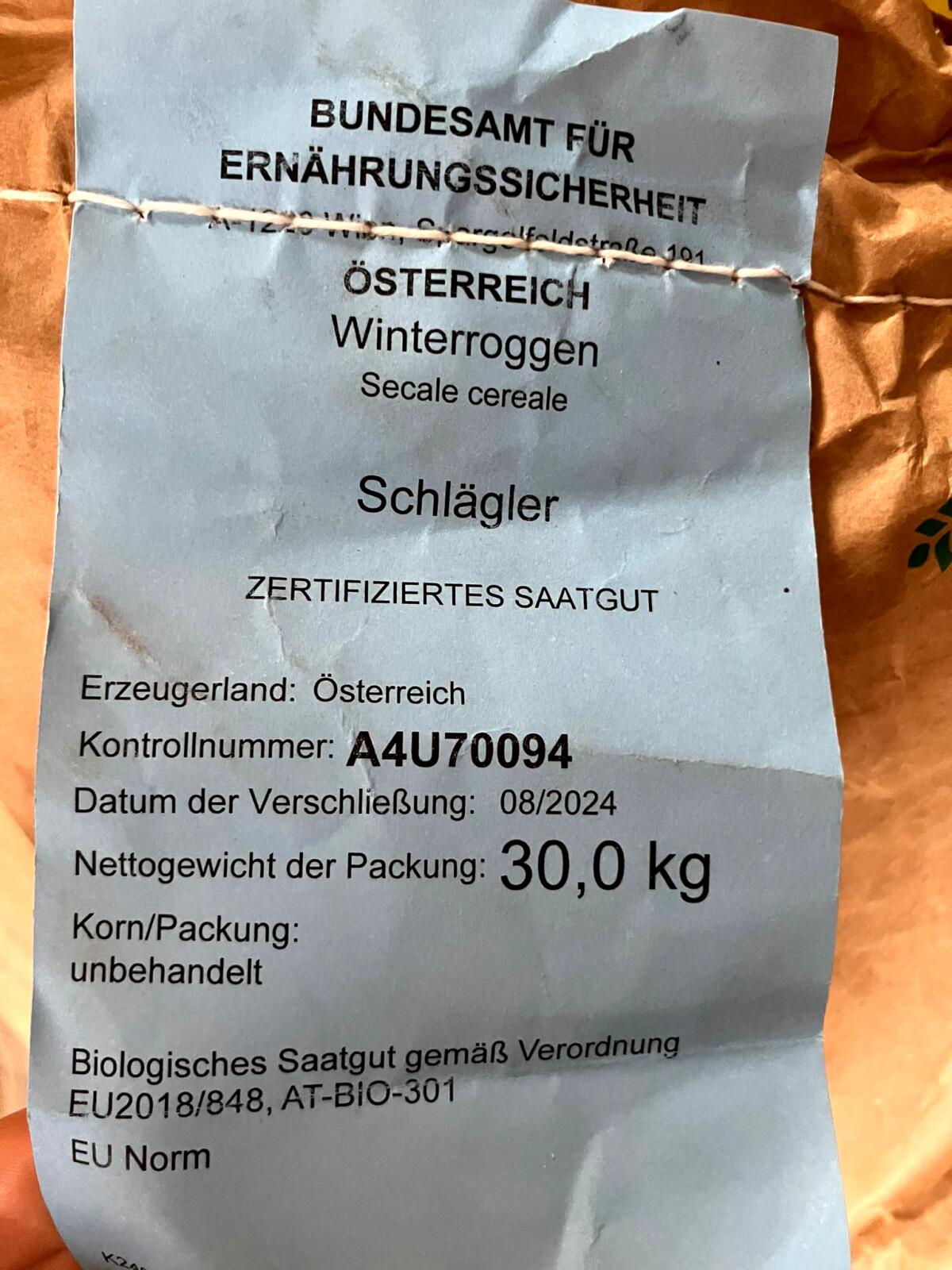 Verkauf 30 kg BIO Saatgut Roggen Sorte Schlägler SLK, aus dem Jahr 2024, original Saatbau Linz.