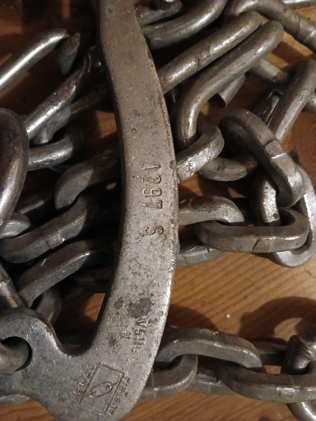 1 Paar, sehr guter Zustand, kaum bis gar nicht gebraucht, nur vereinzelte sehr leichte Roststellen, Zinkschicht nahezu komplett vorhanden, Ketten wie auf den Bildern dargestellt, passend für Reifen lt. Datenblatt von PEWAG.