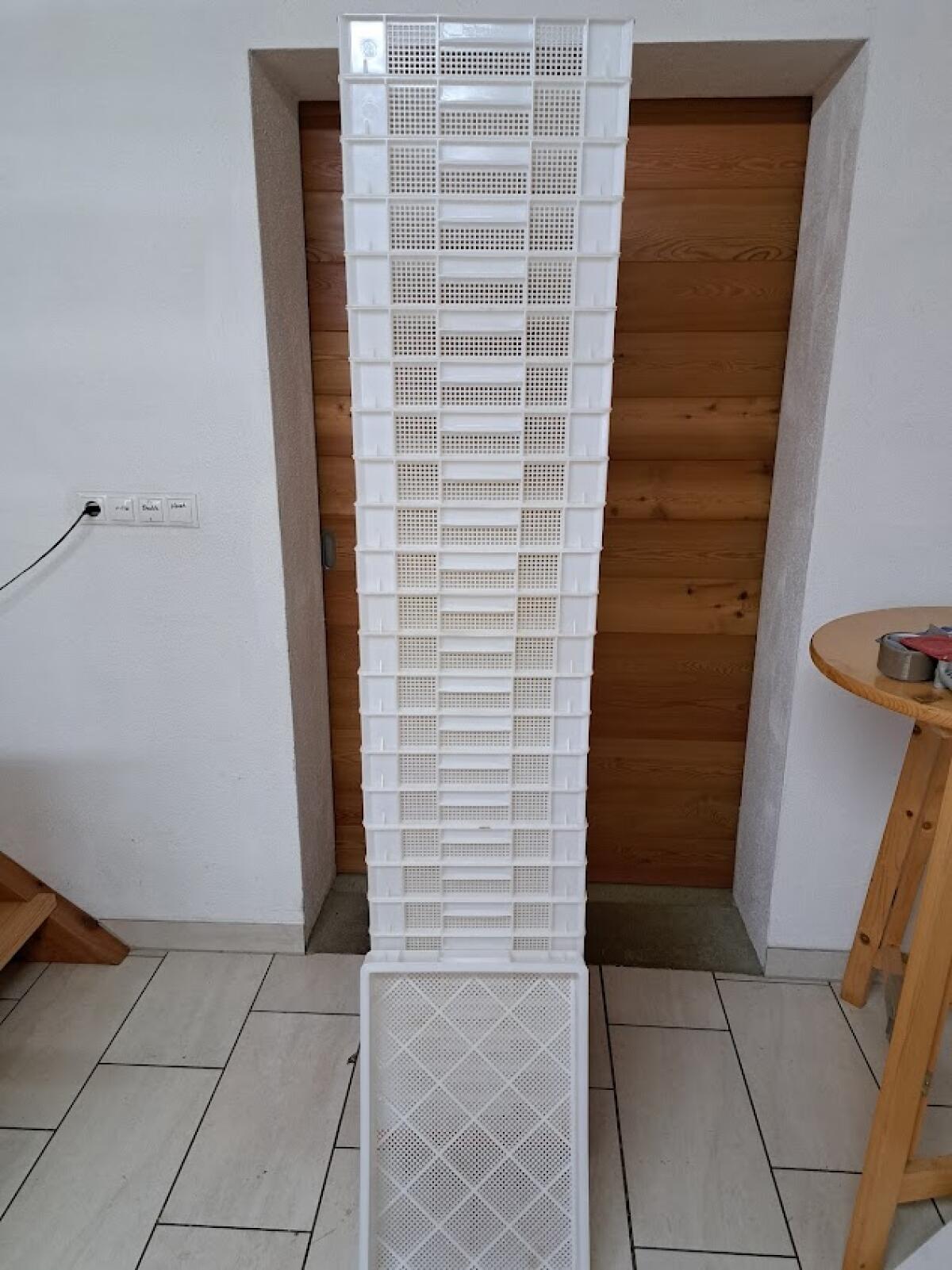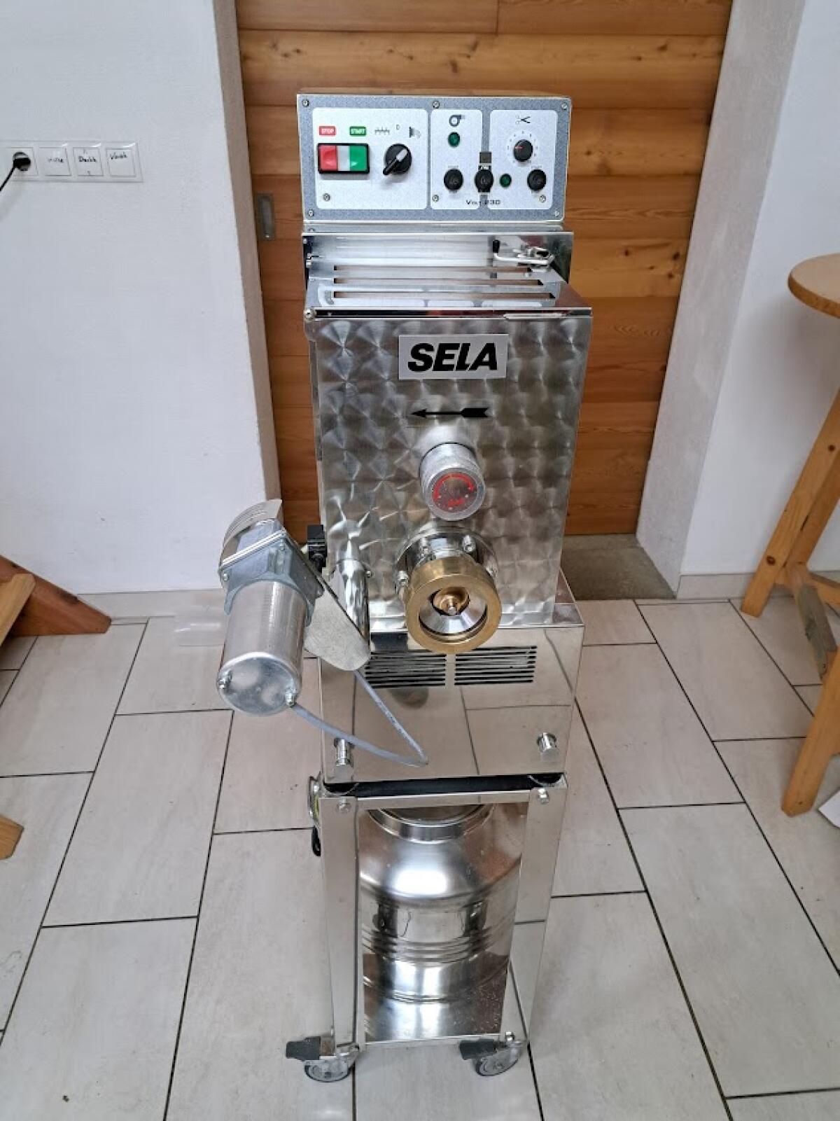 Sela Nudelmaschine, TR75W, wassergekühlt mit ca. 7-8 kg Stundenleistung, mit 6 Matrizen und 50 PVC-Horden, wenig gebraucht, sehr guter Zustand. Wegen Betriebsauflösung zu verkaufen.