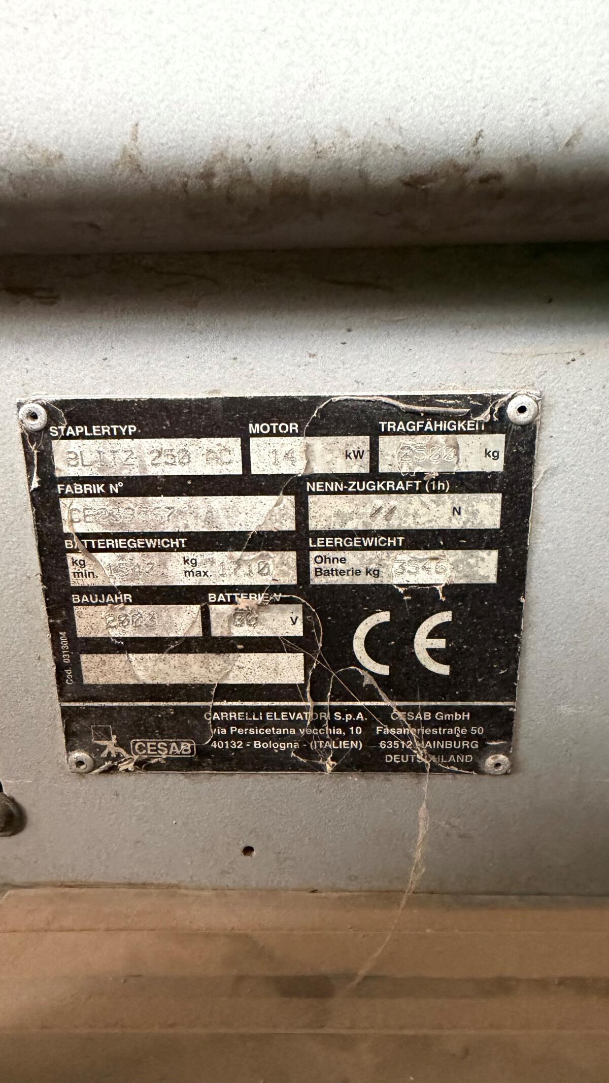 El. Stapler Cesab Blitz 250 AC im guten Zustand. Vor gut 1 Jahr wurden schlechte Batteriezellen getauscht und alle Platinen erneuert. Hubhöhe 5 m, Zinkenlänge 1,4 m.