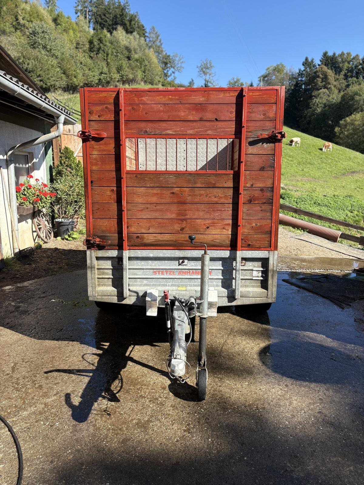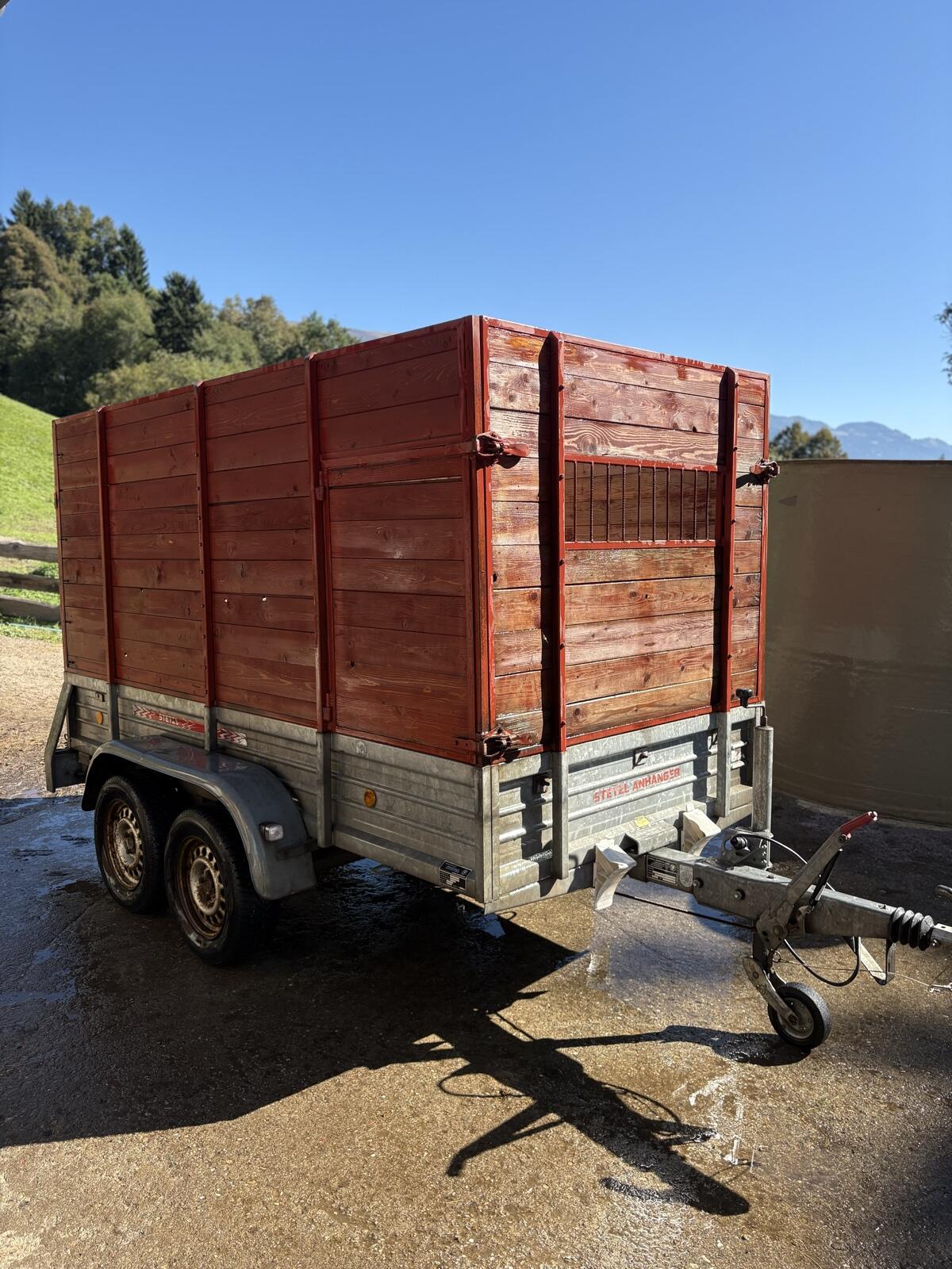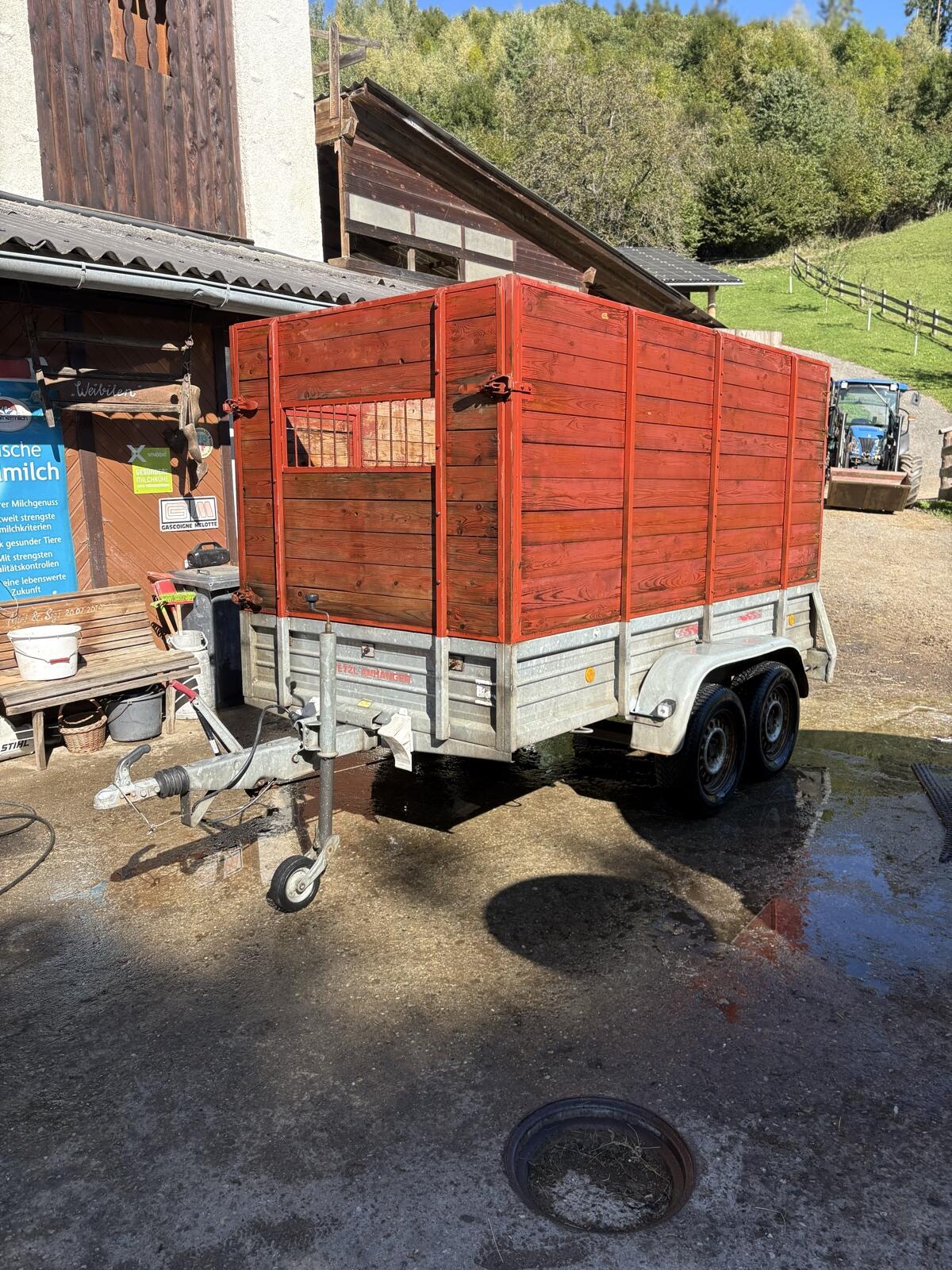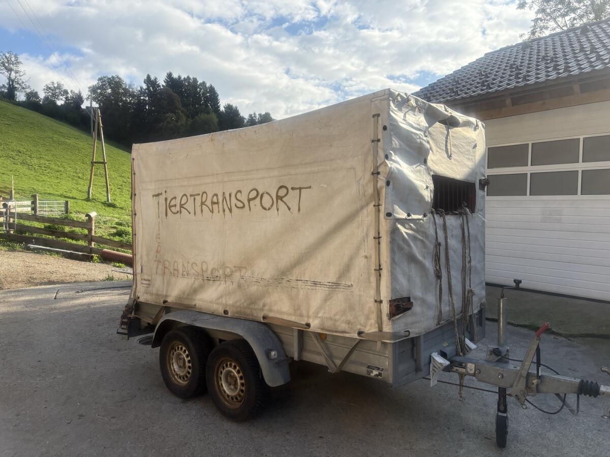 Tandemanhänger mit Auflaufbremse und Tiertransport aufbau. Heckklappe Dreh und schwenkbar und vorne rechts auch eine kleine Tür Plane ist auch noch vorhanden. Höchstzulässige Gesamtgewicht: 2500kg Pickerl gültig bis 05.2026