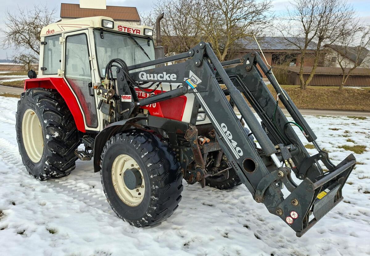Steyr 970 A mit vollhydr. Frontlader Quicke 940, Komfortkabine: Lüftung, Heizung, Luftsitz, 2 Hauptscheinwerfer Dach front, 4 Arbeitsscheinwerfer Dach heck, 2 ew. Stg. Heck (1x el.), 1 dw. Stg. mechanisch Heck, Heckhubwerk Kat. 2, Heckzapfwelle 540/540E/1.000/1.000E, 3-polige Leistungssteckdose Heck, mechanisches Zugmaul, mechanischer Oberlenker, Fronthydraulik, Frontzapfwelle, 1 dw. Anschluss front, Federentlastungshaken, vollhydr. Frontlader Quicke 940 inkl. 3. Anschluss, Parallelführung, Schwingungstilgung, Faster-Schnellkuppler, Kreuzsteuerhebel mechanisch. Bereifung: vorne Michelin 375/75 R20, hinten BKT Agrimax RT855 420/85 R30.