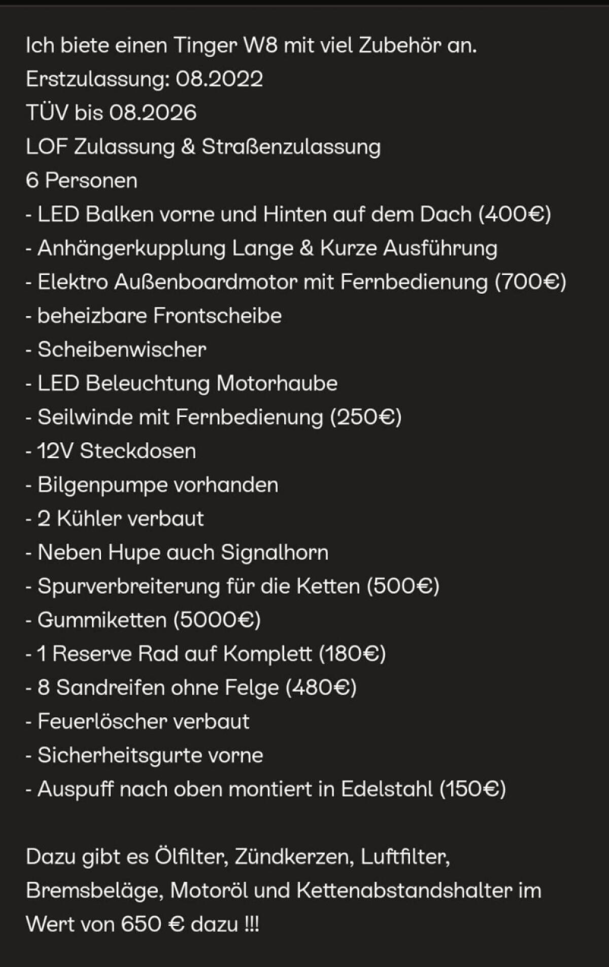 Ich biete einen Tinger W8 mit viel Zubehör an. EZ: 08.2022. TÜV bis 08.2026. LOF-Zulassung, Straßenzulassung. 6 Personen. LED-Balken vorne und hinten auf dem Dach, Anhängerkupplung, lange und kurze Ausführung. Beheizbare Frontscheibe, LED-Beleuchtung Motorhaube. Seilwinde mit Fernbedienung, 12 V-Steckdosen, 2 Kühler verbaut, Signalhorn, Spurverbreiterung und einen Außenbordmotor el. sowie einen Satz Gummiketten und 8 Sandreifen ohne Felge. Es gibt auch Videos auf YouTube (Tinger Weserbergland).
