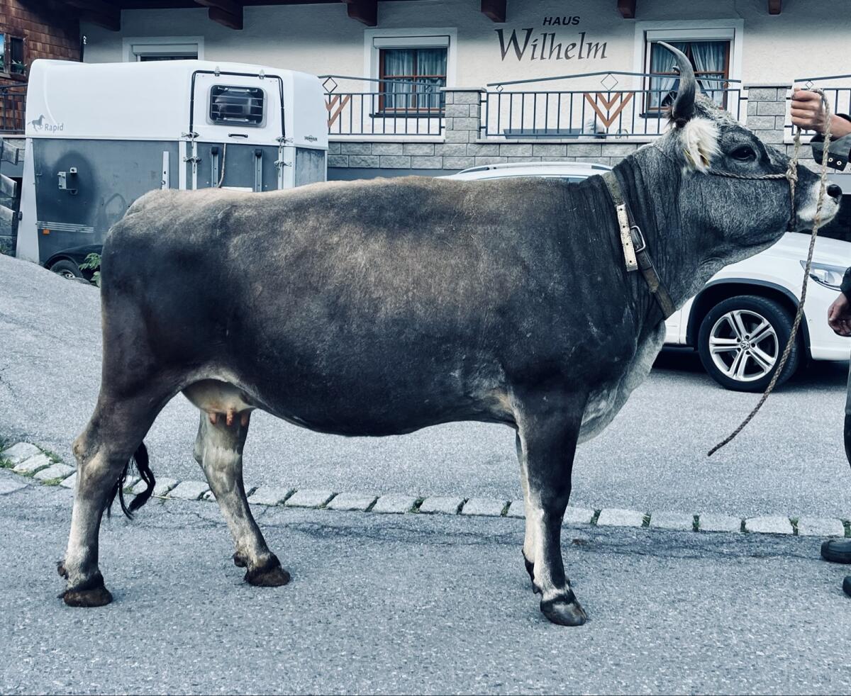 Verkaufen trächtige HB-Grauviehkuh, halfterführig und gutmütig.