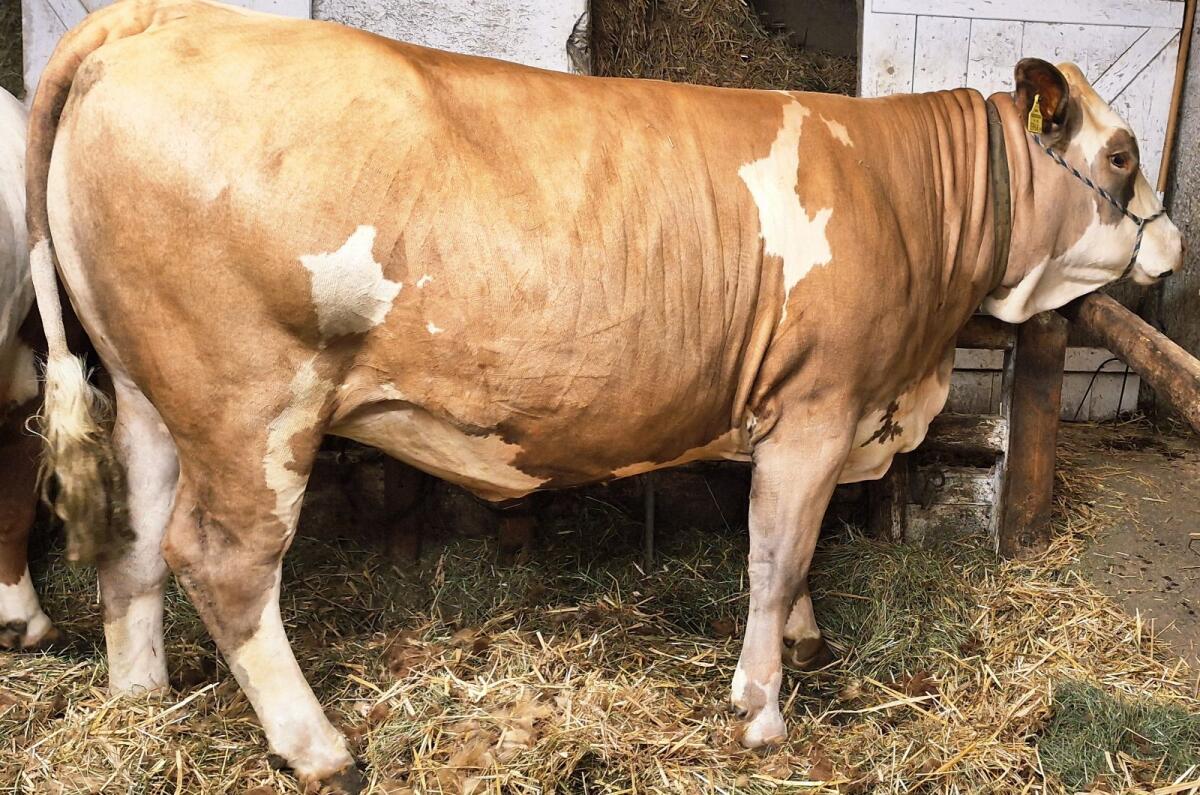 Aufzuchtbetrieb verkauft schwere trächtige Fleckviehzuchtkalbin, top Exterieur und Abstammung, reines Euter, geweidet, Kombinationshaltung.