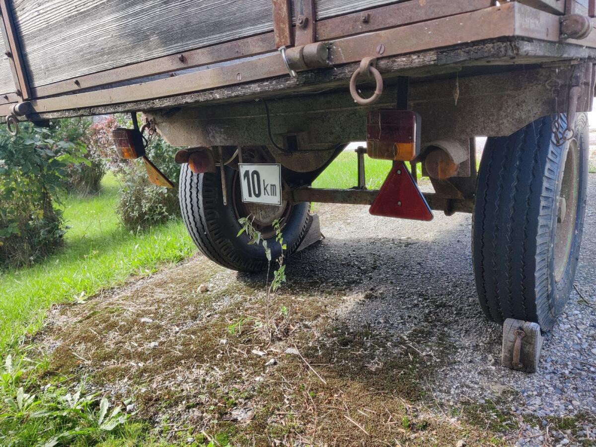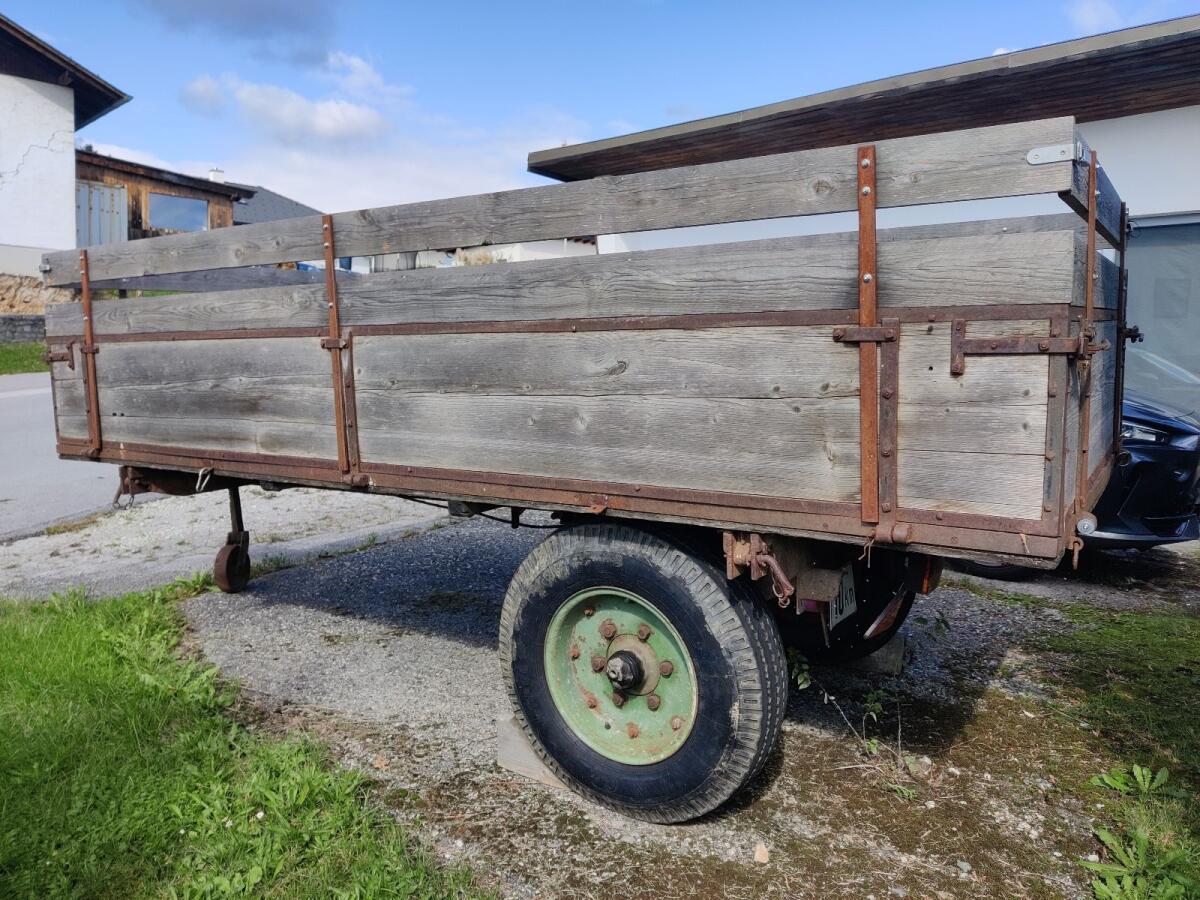 Verkaufe alten Traktoranhänger, 1,6 m breit, 3,4 m lang, siehe Fotos, neue Reifen vor 2 Jahren montiert, Radlager links neu, Beleuchtung funktioniert. Preis verhandelbar.