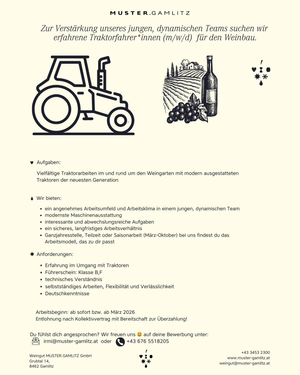 Zur Verstärkung unseres jungen, dynamischen Teams suchen wir erfahrene Traktorfahrer*innen für die Durchführung vielfältiger Traktorarbeiten im und rund um den Weingarten mitten in der Südsteiermark. Wir verfügen über einen neuen Fuhrpark mit modernsten, komfortabel ausgestatteten Traktoren der neuesten Generation. Ganzjahresstelle, Teilzeit oder Saisonarbeit (März-Oktober). Anforderung: Führerschein B/F, Erfahrung im Umgang mit Traktoren, technisches Verständnis, selbstständiges Arbeiten, Flexibilität und Verlässlichkeit, Deutschkenntnisse. Bei entsprechender Qualifikation bieten wir eine Überzahlung über den Kollektivvertrag. Wir freuen uns sehr auf DEINE Bewerbung.