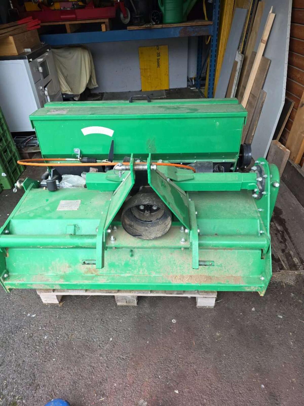 Neuwertige Geo SB125 Bodenumkehrfräse inkl. Saatkasten mit integrierter Nachlaufgitterwalze Dm. 30 cm, robuste Ausführung für Traktoren ab ca. 30 PS. Sie eignet sich hervorragend für die Anlage neuer Rasenflächen oder das Einebnen von Wildschäden. Die groben Bestandteile fallen vor das Gitter in die Fräsgrube. Die Nachlaufwalze sorgt für eine Glättung der entstandenen Unebenheiten. Technische Details: Modell: SB125, AB: 125 cm, Gesamtbreite: 135 cm, max. Arbeitstiefe: 16 cm, Anzahl der Messer: 24 Stk. (4 Messer pro Flansch), 3-Punkt-Aufnahme: Kat. 1/2, Zapfwellengeschwindigkeit: 540 U/min.