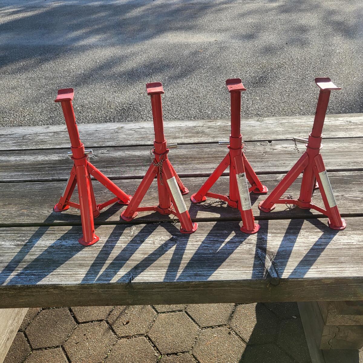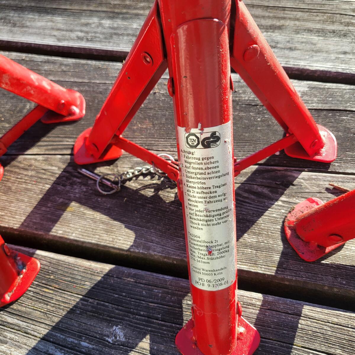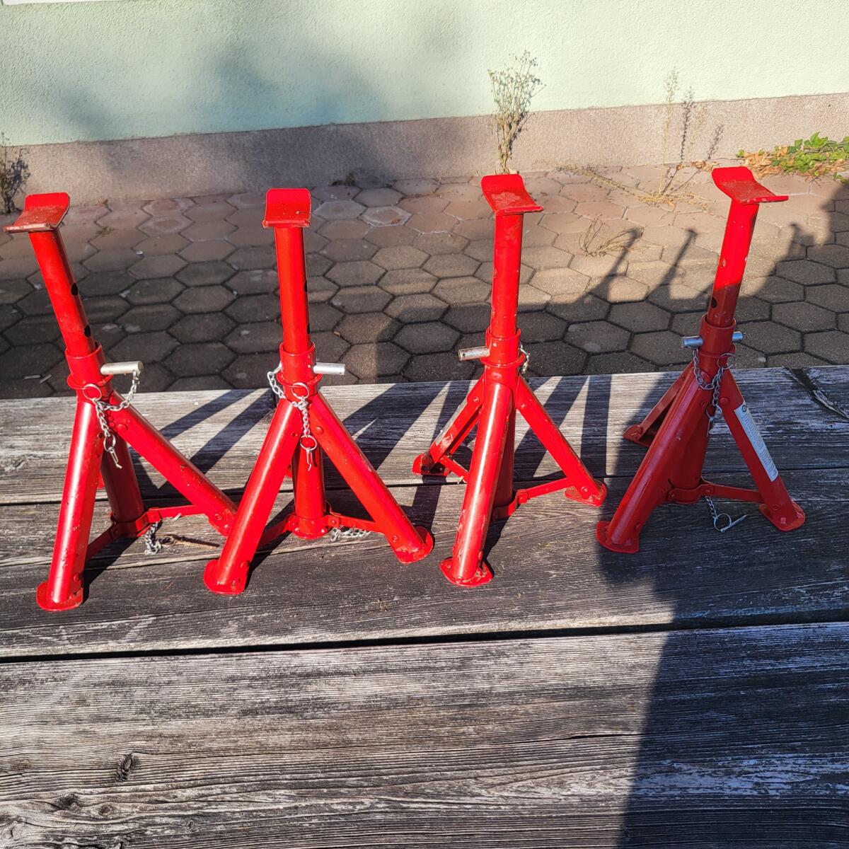 4 Stk. Unterstellböcke, zusammenklappbar und ausziehbar von min. 267 mm bis max. 363 mm Stützhöhe mit Sicherheitsverriegelung, 2 t belastbar.