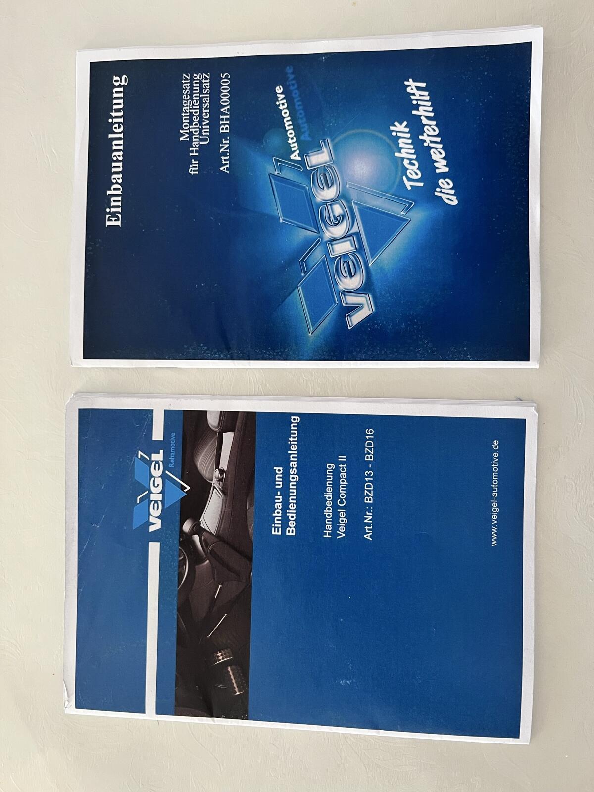 Handbedienung Veigel (Gas und Bremse mit Hand bedienbar), mit Fußplatte, ohne die Beine mit der Hand zu steuern. Mit Papiere, eingebaut ohne Spuren. Kfz-Firma eingebaut und Demontage, Top-Zustand. Siehe Fotos. Die Veigel Handbedienung Compact II vereint innovative Bedienung mit hohem Komfort und elegantem Design. Zur Beschleunigung wird der ergonomisch geformte Handgriff nach hinten gezogen, ein leichter Druck nach vorne aktiviert die Bremse. Eine kurzzeitige Arretierung der Bremse ist mittels eines im Griff integrierten Mechanismus leicht möglich. Die neue Generation von Veigel Handbedienungen lässt sich bei Nichtgebrauch noch leichter nach hinten klappen.