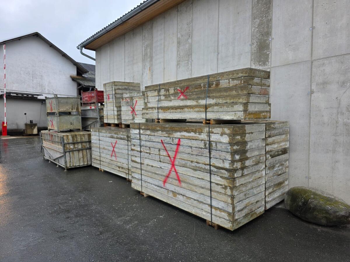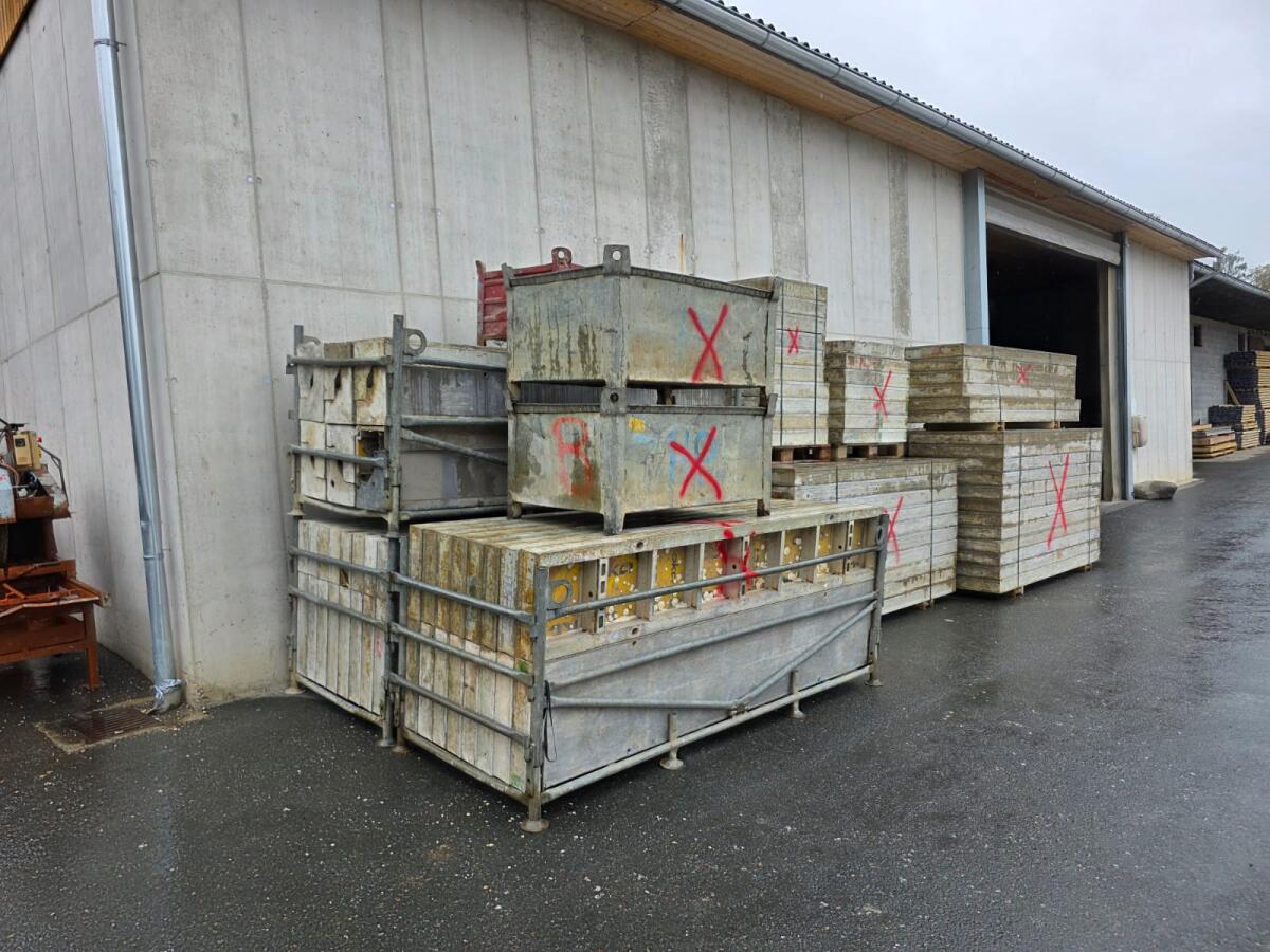 Wandschalung gebraucht, teilweise Plattenbelag neu, folgende Platten: 24 Stk. 2,70m*0,90, 40 Stk. 2,70m*0,75, 12 Stk. 2,70m*0,60, 8 Stk. 2,70*0,55, 8 Stk. 2,70m*0,45, 8 Stk. 2,70m*0,30, 12 Stk. Innenecke 2,70m, 6 Stk. 0,55*0,90, 4 Stk. 0,90*0,90, 6 Stk. 0,75*0,90, 6 Stk. 0,60*0,90. Gesamt 220m². Besichtigung werktags zwischen 7 und 17 Uhr jederzeit möglich.