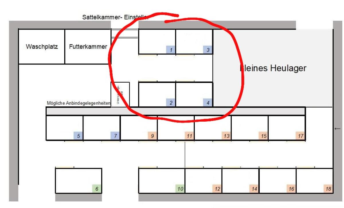 Wir sind ein kleiner Stall, in dem aktuell nur unsere eigenen und Berittpferde untergebracht sind. Also kein 'normaler' Einstellbetrieb, daher würde ich diesen Stalltrakt auch am liebsten an eine private Person mit mehreren Pferden vergeben. Es findet lediglich 3x pro Woche Reitunterricht statt, wobei hier auch kein klassischer Schulbetrieb stattfindet, sondern ausschließlich Einzelunterricht, bei dem sämtliche Reitflächen parallel dazu nutzbar sind. Unsere Anlage bietet die Unterbringung in Vollpension: individuelle Fütterung, 7x/Woche Ausmisten, Paddock + Weideservice, beheizte Sattelkammer + Stüberl, Indoor-Waschplatz + Solarium, Reithalle, Dressurviereck, Springplatz, kleine Ausreitrunde direkt am Hof.