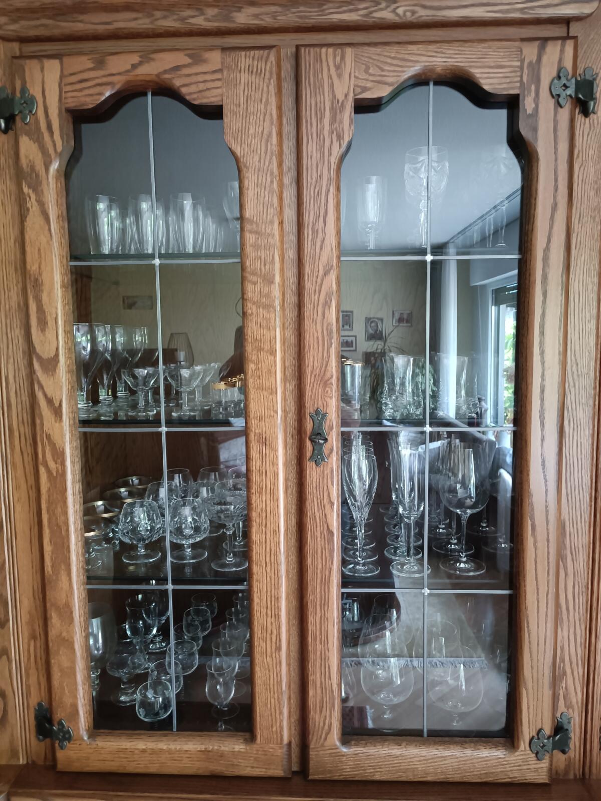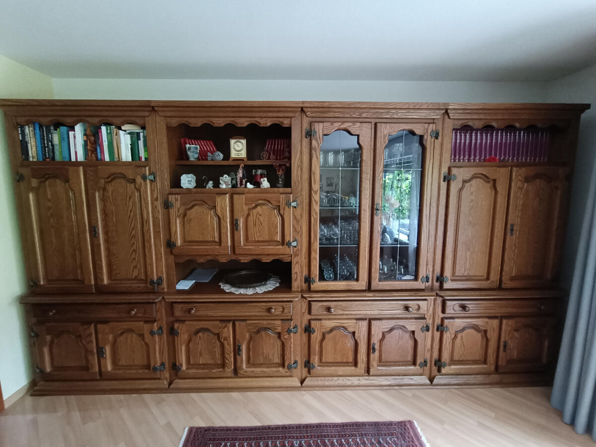 Verschenke eine massive Eiche Schrankwand, mit eingebauter Bar (Spiegel, Licht). Die Schrankwand ist in einem Neuzustand und bietet extrem viel Stauraum. Kann in 4 Elemente à 1 m Breite aufgeteilt werden. Maße: 4 m (4x1 m) B x 2,10 m H x 0,65 m T.