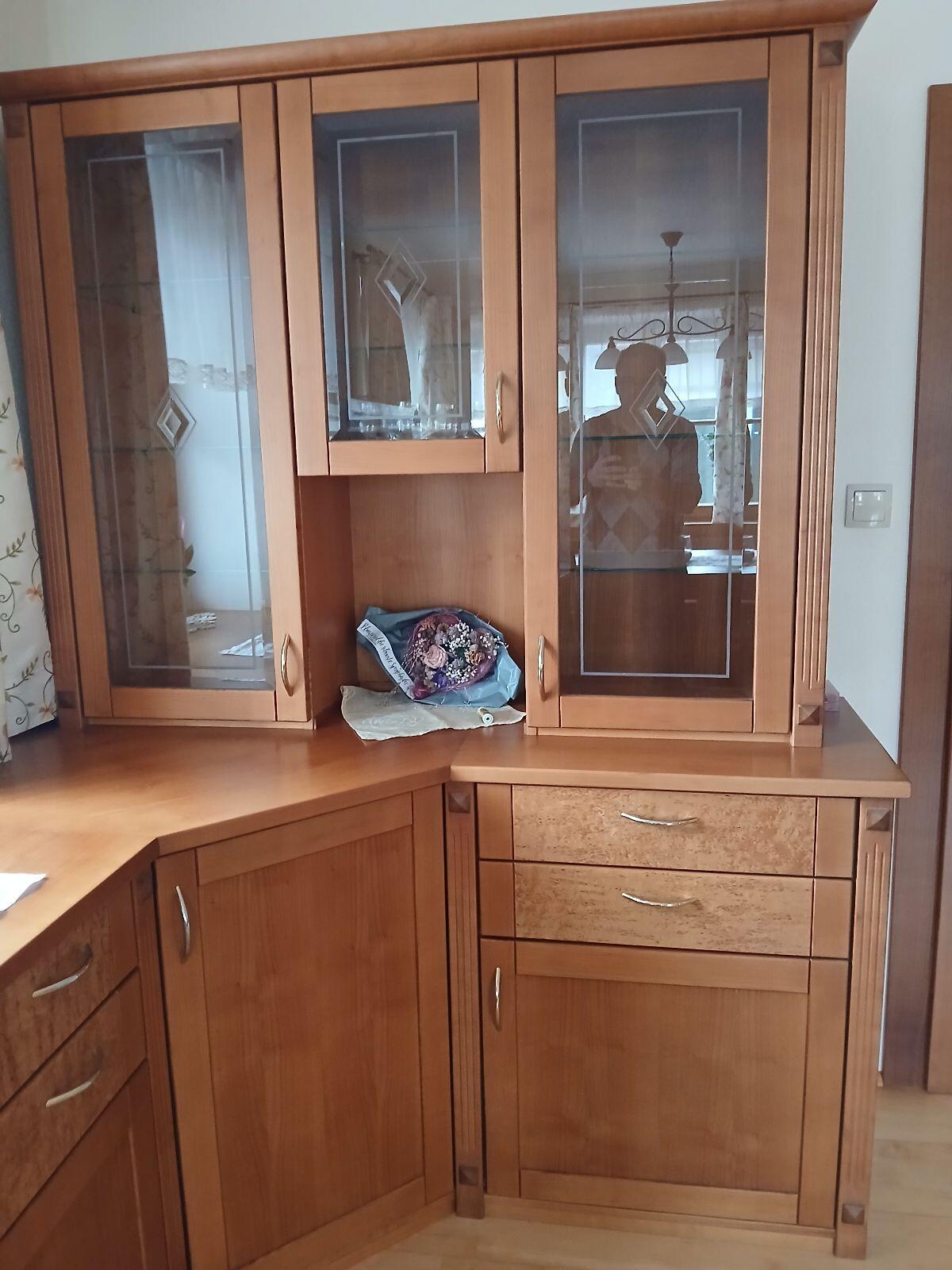 Wohnzimmer, Kirsch mit Wurzelholz, vom Tischler, Tisch 160 auf 200 cm ausziehbar, Vitrine 160 cm mit Beleuchtung, Glas mit Einlage, Top Zustand.