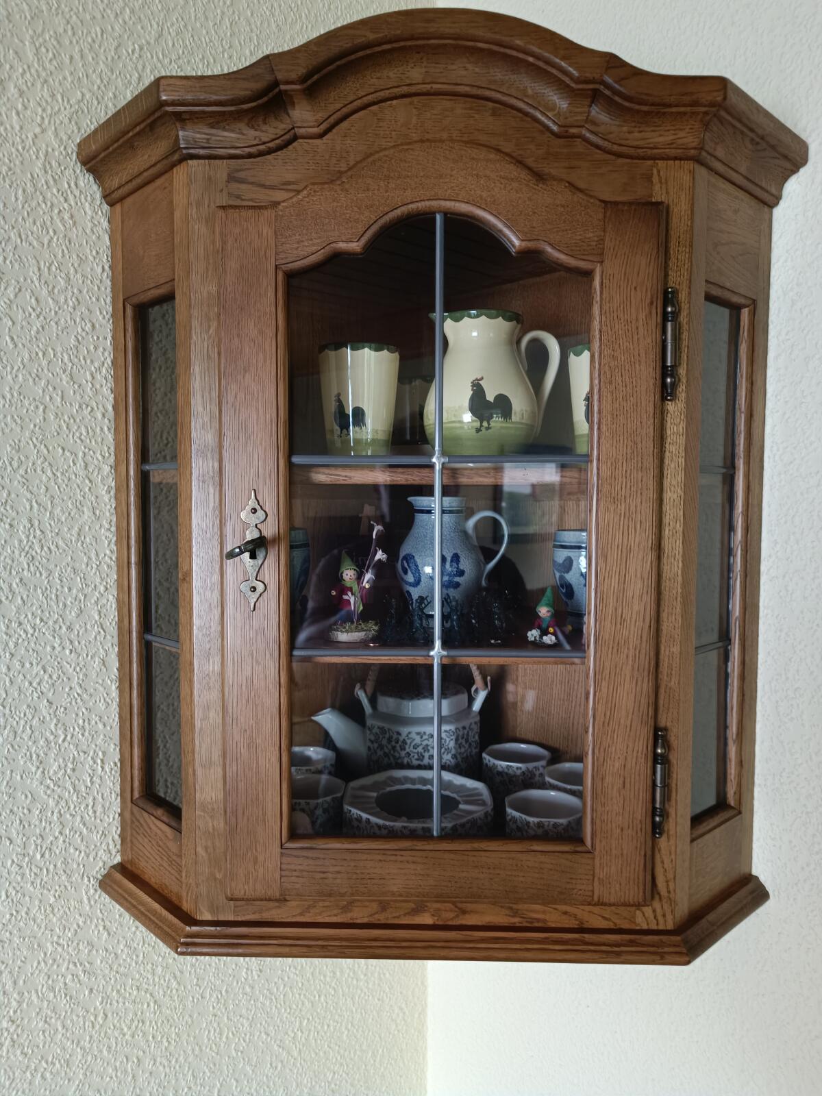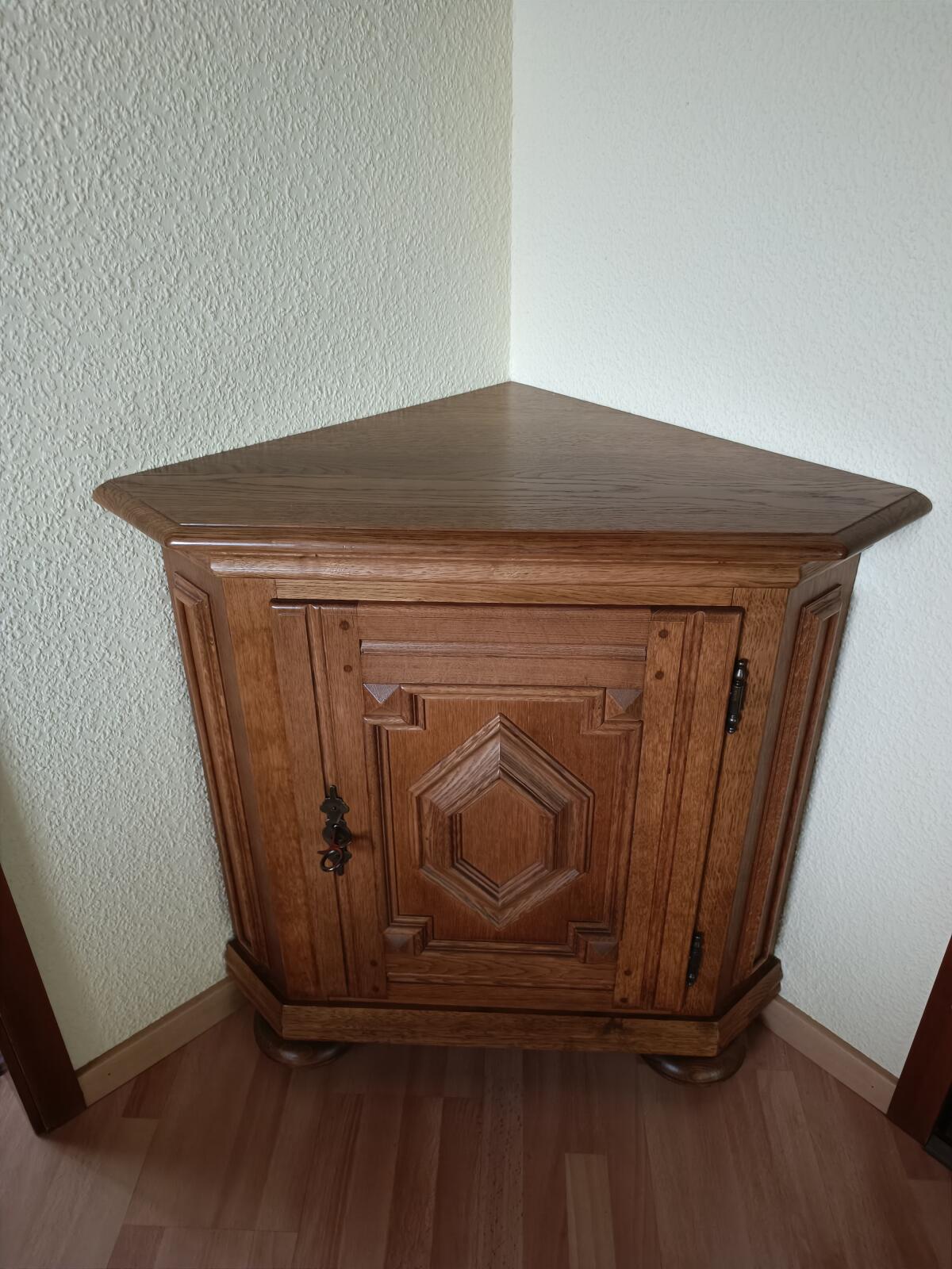 Verkaufe eine Kombination aus Eckhänge- und Eckschrank. Beides Massivholz. Maße Hängeschrank: 70 cm H x 60 cm B x 40 cm T, Eckschrank: 78 cm H x 78 cm B x 50 cm T.