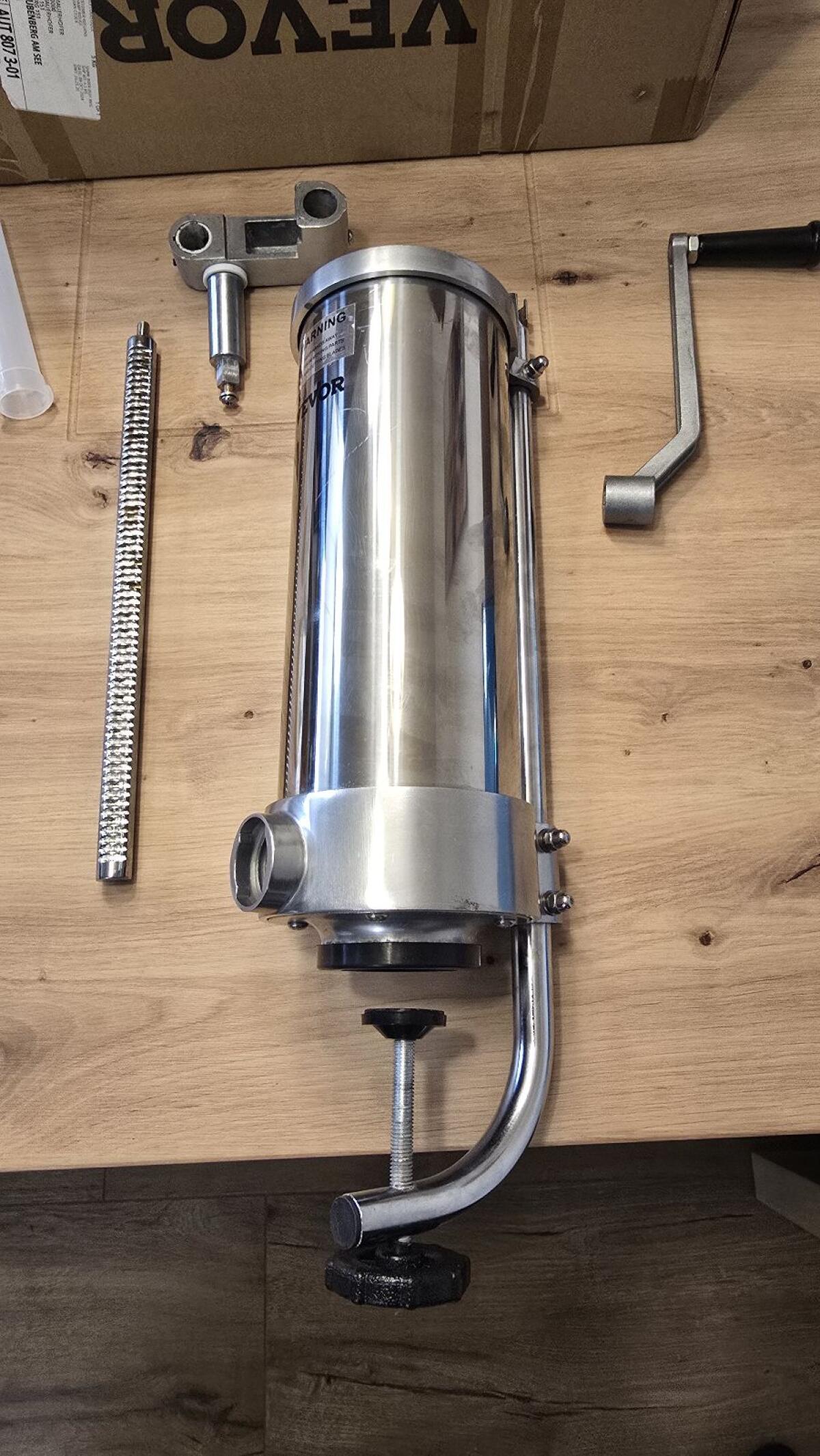 Ich würde gerne meinen manuellen Wurstfüller der Marke Vevor veräußern, da ich auf ein Elektrisch Bedienbares Modell umsteigen möchte. Er besitzt ein Fassungsvermögen von 3l und Es wurden in etwa 100kg Wurstmasse damit verarbeitet. Nach jedem gebrauch wurde er gründlichst gereinigt und mit dem Desinfektionsmittel 'Blutoxol' für den nächsten gebrauch vorbereitet. Der Preis ist Verhandlungssache, bei Fragen bitte melden.