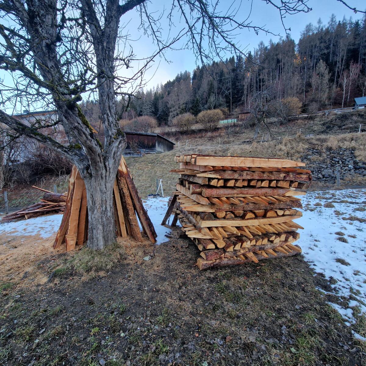 Verkaufe Lärchenstipfel, 100 Stk., mindestens 1,6 m, ca. 12 x 12 cm, mit Rinde, ganze, halbe, viertelte.