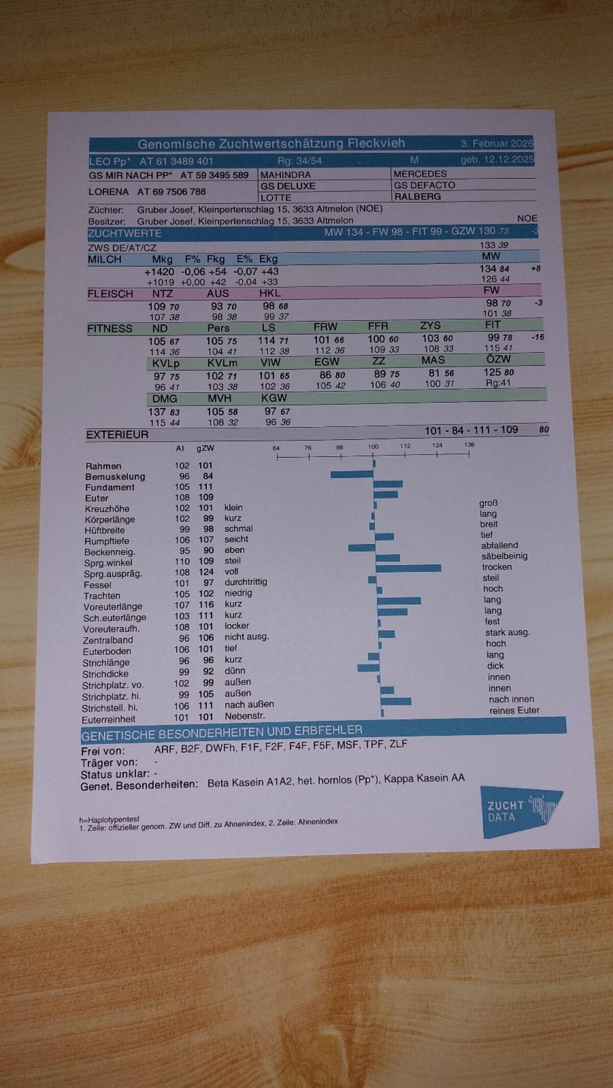 Verkaufe Zuchtstier, geboren 12.12.2025, genetisch hornlos, Befund von genomischer Zuchtwertschätzung.
