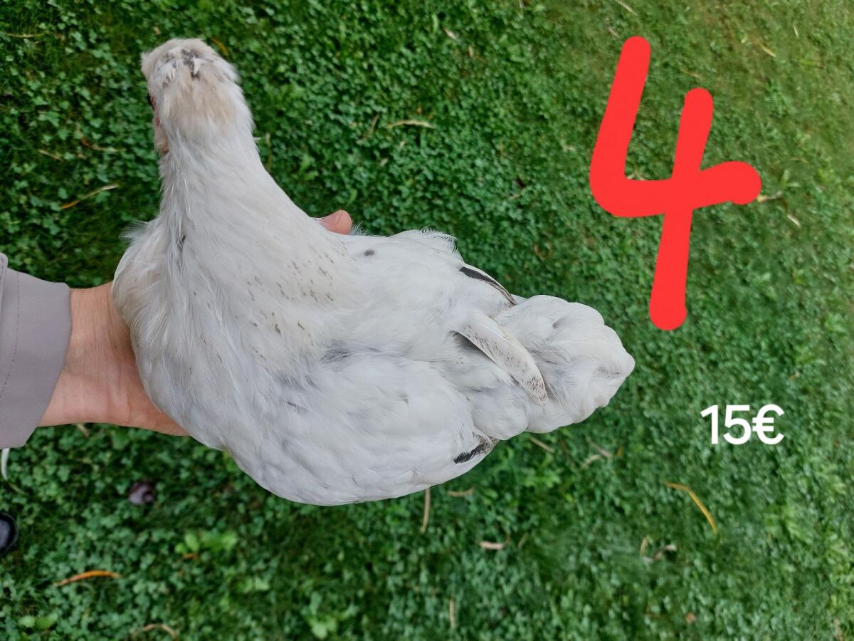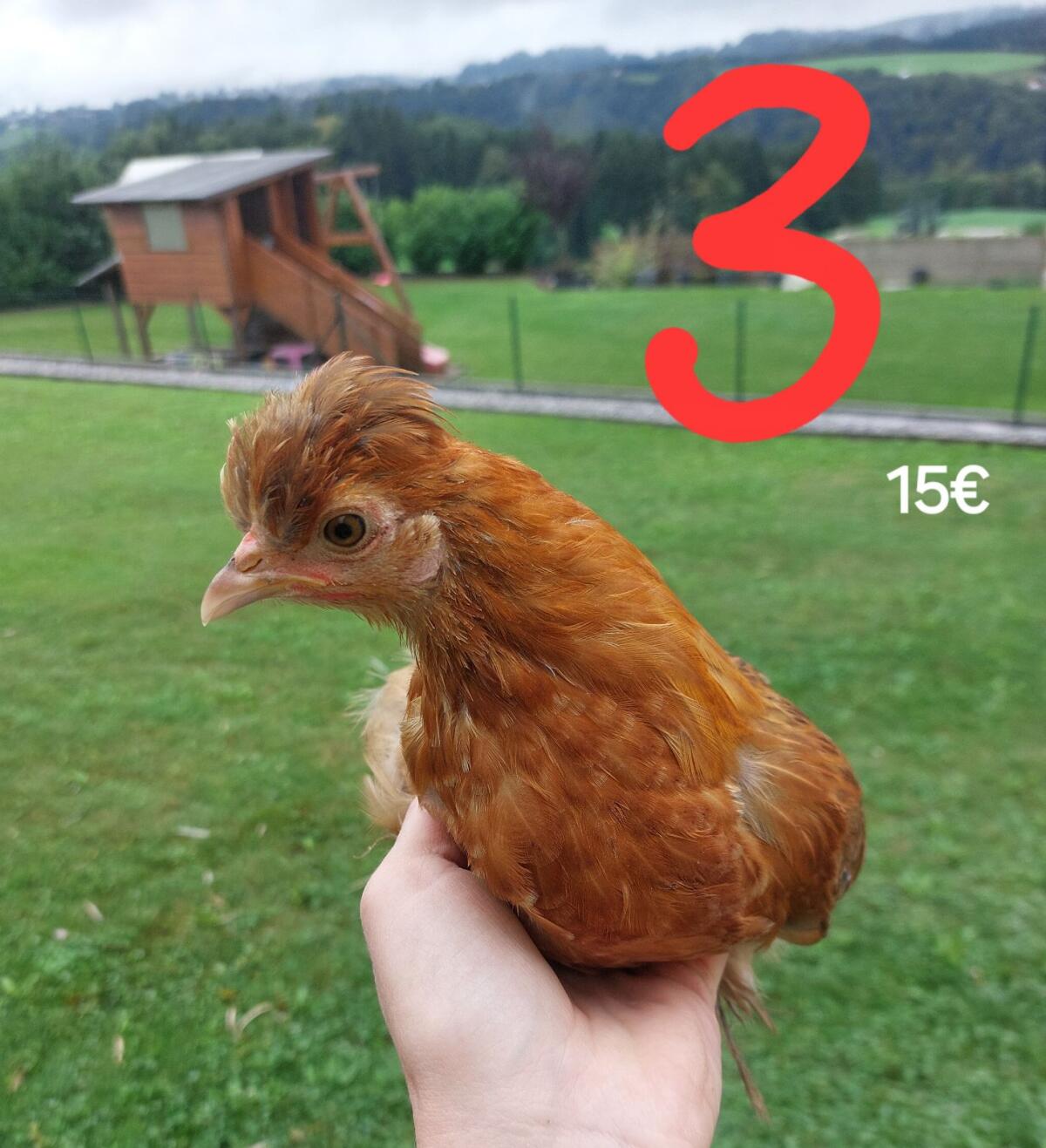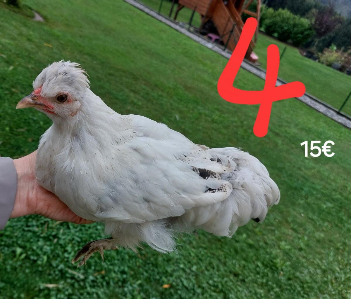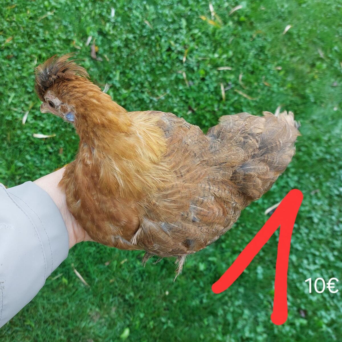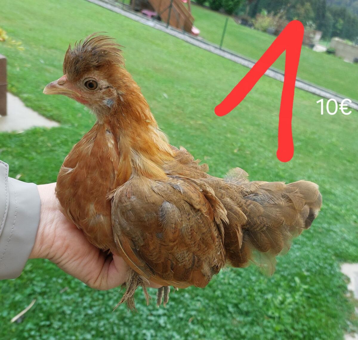 Es sind Mixe aus Zwergcochin und Seidenhuhn, sehr zutrauliche Hühner, ca. 10 Wochen alt. Preis: € 10,- bis € 15,-.