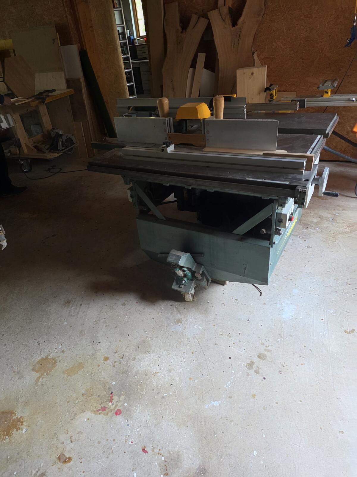 Kreissäge, Abrichthobel, Dickenhobel, Tischfräse, Langlochbohreinrichtung, Formatsäge, Hobelwelle 400 mm, 2 Motoren 3 kW, die Maschine ist einsatzbereit und wird weg