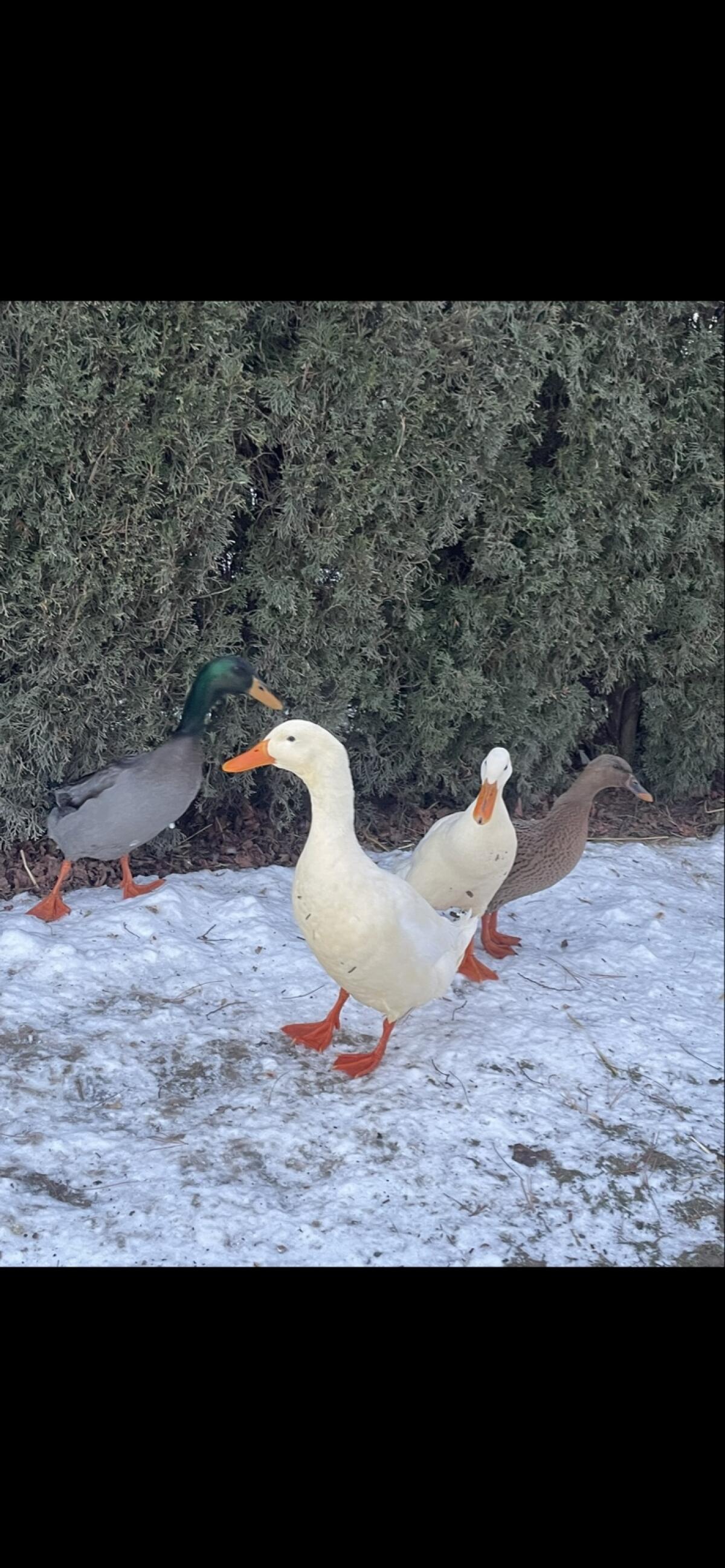 Zweijährige Enten, brave Schneckenfänger, einer der Erpel ist zu vergeben und 3 der Enten - nicht die weiße. Sind Freigänger und kommen jeden Tag zurück in den Stall