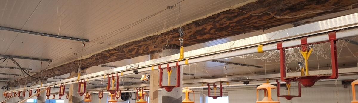 Stalleinrichtung für Hähne, Hühner oder Masthühner, 3 Futterbahnen mit Antrieb und Zufuhrschnecke, 4 Getränkebahnen mit Antrieb und Höhenfeinverstellung, Aufsitzfläc