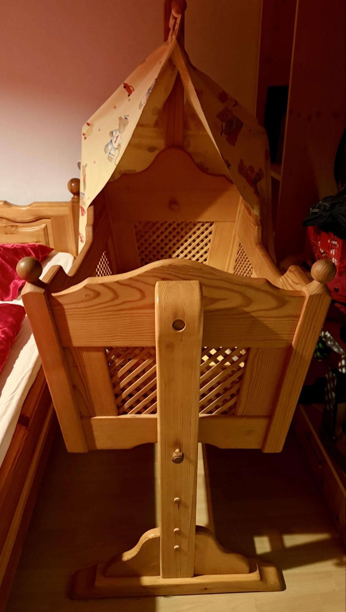 Zum Verkauf steht eine hochwertige, handgefertigte Holzwiege aus echter Tischlerarbeit. Es handelt sich um ein Unikat aus Massivholz, das durch seine stabile Verarbe