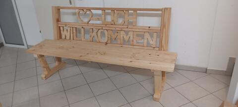 Gartenbank aus Lärche, massiv und robust, mit Spruch. Auch in Fichte und mit anderen Sprüchen möglich. Länge 1, 95 m, Höhe 96 cm, Tiefe 43 cm, Sitzhöhe 45 cm. Haus un