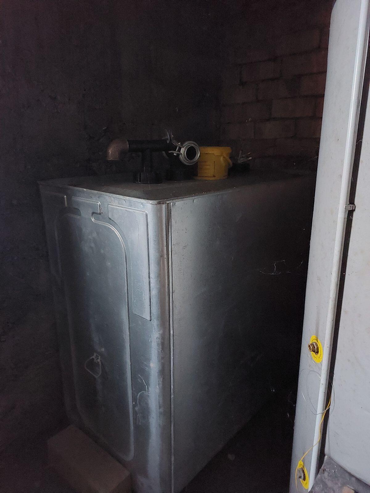Fotos vor dem Anschluss, Anschlüsse 6/4“. Preis pro Stk. 2 schwarze Höhe 235 cm, Dm. 125 cm, 1 blauer Höhe 220 cm, Dm. 135 cm. Speicher noch mit Heizungswasser unter