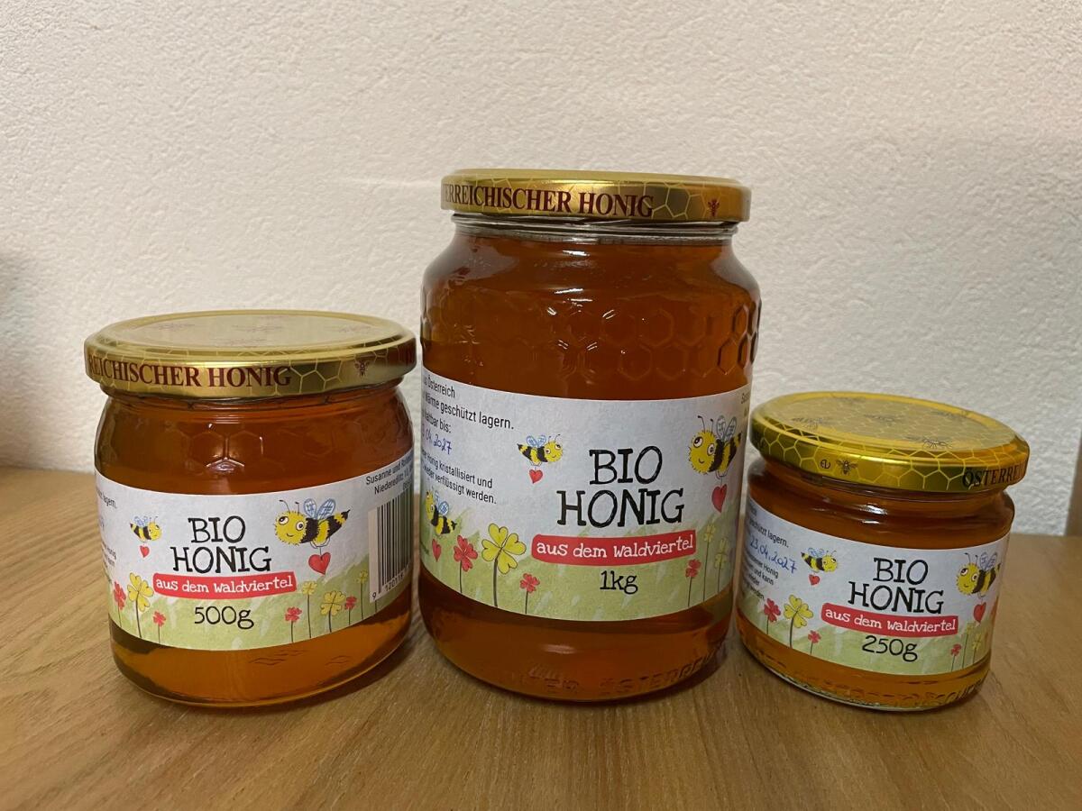 Honig aus dem Strudengau, Ernte 2025, Blüte mit Wald, 250 g € 5, -, 500 g € 8, -, 1.000 g € 15, -, Selbstabholung in 4371 Dimbach, gerne können Sie bei der Abholung den