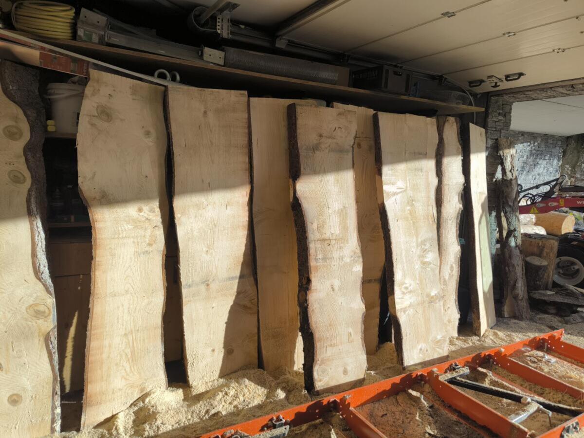 Vergebe Tischplatten in Astfichte, frisch geschnitten mit Waldsaum. Ideal für Naturholzmöbel im Außenbereich. Auf dem Bild sind 10 Stk. zu sehen, wobei derzeit nur m