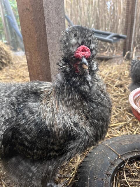 Reinrassiger Sandschakkräher-Hahn. Zahm, gutmütig, wird auch als Geierschreck zur Gruppe zugefügt. Am 1. Mai 2025 geschlüpft. Hühner Hähne