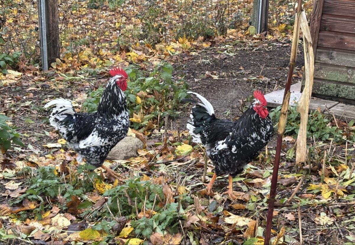 Zum Abgeben wären drei zutrauliche und menschenbezogene Hähne aus Kunstbrut. Es handelt sich um große Australorps im Farbschlag schwarz, Splash und blau gesäumt. Seh