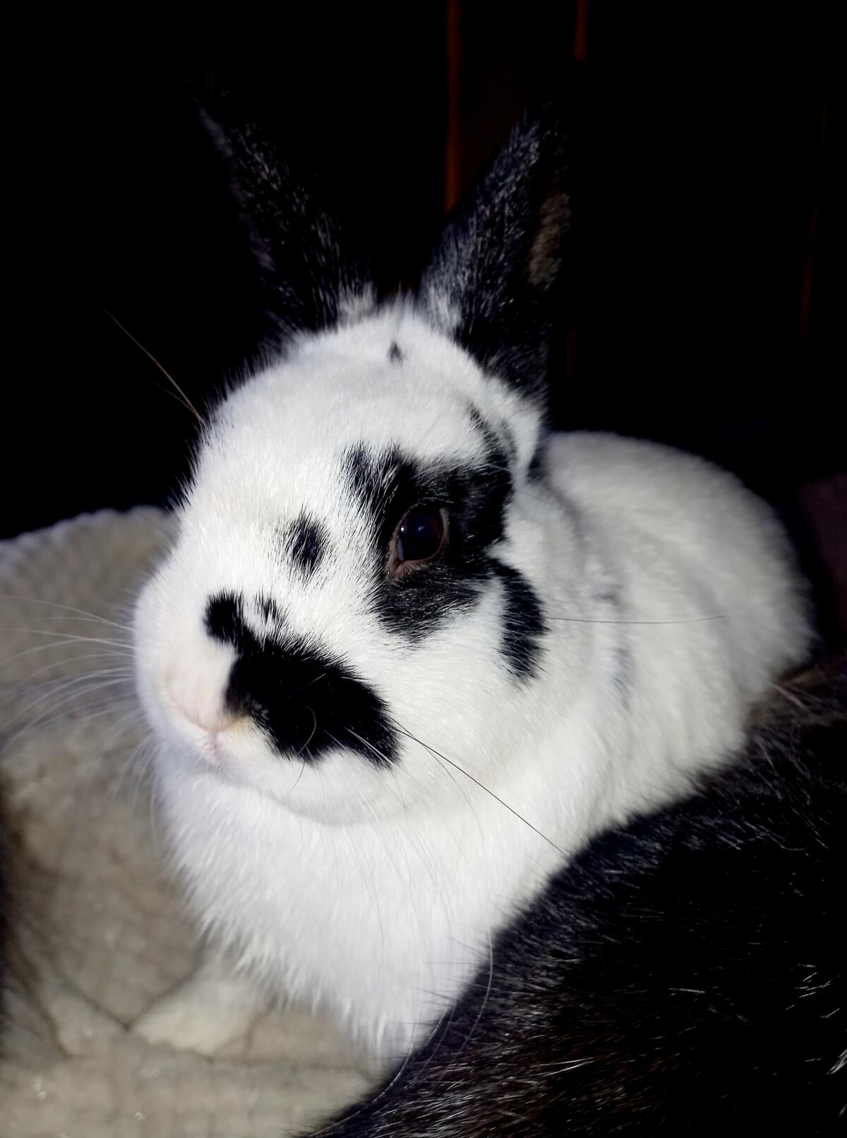 Sehr süßes schwarz-weiß geflecktes Zwergkaninchen, männlich, 4 Monate alt, nicht kastriert, ganz zahm und an Kinder gewöhnt, ab sofort auf einen schönen Platz zu ver