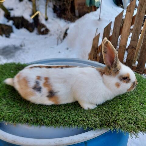 Verkaufe Riesen Scheck Rammler in 4 Farben. Alter 7 Monate. Wird sehr groß. Braver Zuchtrammler. Kaninchen / Hasen Riesenkaninchen