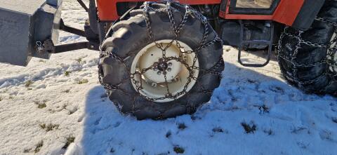 Die Ketten waren auf 480/65 R24 montiert. Jedoch schon ein wenig verbraucht und nicht für den Dauereinsatz geeignet. Die Ketten kann man nur seitlich verbinden, somi