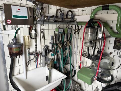 Verkaufe GEA/Westfalia Rohrmelkanlage mit Vakuumpumpe RPS 600, Reinigungsautomat, zwei Stimopulsgehänge und Milchtank 550 l mit Kühlaggregat und komplette Elektrotec