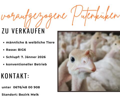 Zum Verkauf stehen voraufgezogene Putenküken der Rasse BIG6 mit Schlupftag: 7.1.2026. Für nähere Informationen bitte um Kontaktaufnahme. Geflügel Puten