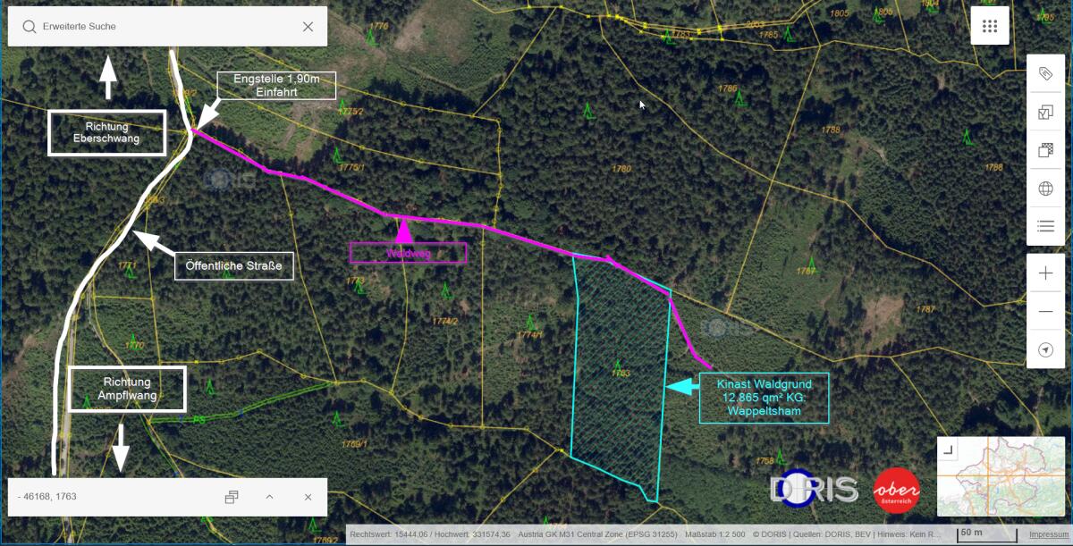 Das Grundstück befindet sich in 7423 Grafenschachen an der Grenze Burgenland/Steiermark, Zufahrt von 2 Seiten möglich, nach Sturmschaden wurde in etwa die untere Häl