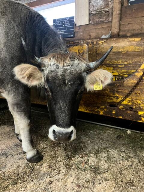 Verkaufen hochträchtige Tiroler Grauvieh Kalbin aus konventioneller Mutterkuh-Zucht, Anbindehaltung, sehr zutrauliches und verschmustes Wesen. Soll-Kalbedatum Ende F