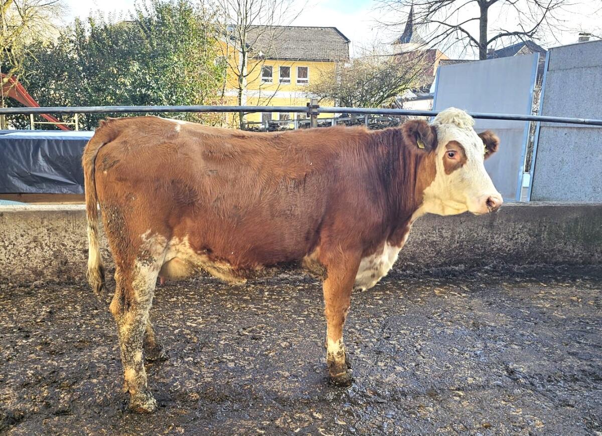Junge Fleckviehkuh, geb. 7.9.23, belegt am 17.1.26, Tagesmilch 28 l, konv. Heumilchbetrieb, Klauenpflege wurde durchgeführt. Rindermarkt Fleckvieh