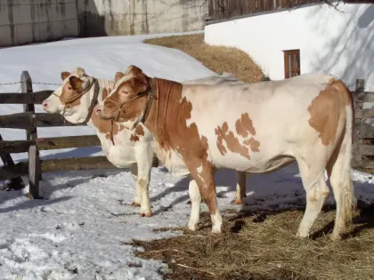 Wir suchen ein liebevolles neues Zuhause für unsere Fleckvieh-Zuchtkalbinnen Vicki und Sally. Beide gealpt. Aus Kombinationshaltung. (Soll-)Abkalbung am 27.05.2026 u