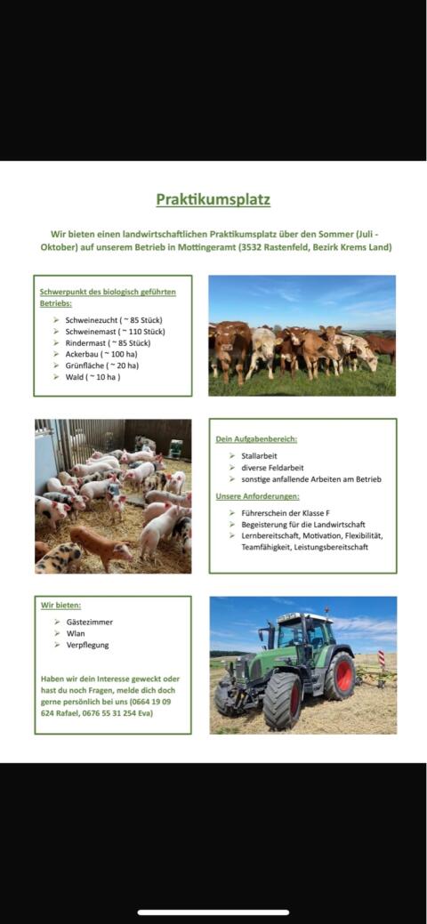 Praktikant/in gesucht. Wir sind noch auf der Suche nach einem Praktikant/in für den Sommer 2025. Wir sind ein landwirtschaftlicher Grünlandbetrieb (20 ha) mit Urlaub