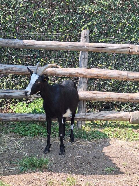 Das ist Henry, er sucht einen neuen Platz. Er ist 2 Jahre alt und braun, schwarz, weiß. Er ist ein bisschen ein kleinerer Bock, aber reinrassig. Ziegen Scheckenziege