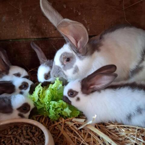 Deutsche Riesenschecken in den Farben schwarz, blau und havanna. Kaninchen / Hasen Riesenkaninchen