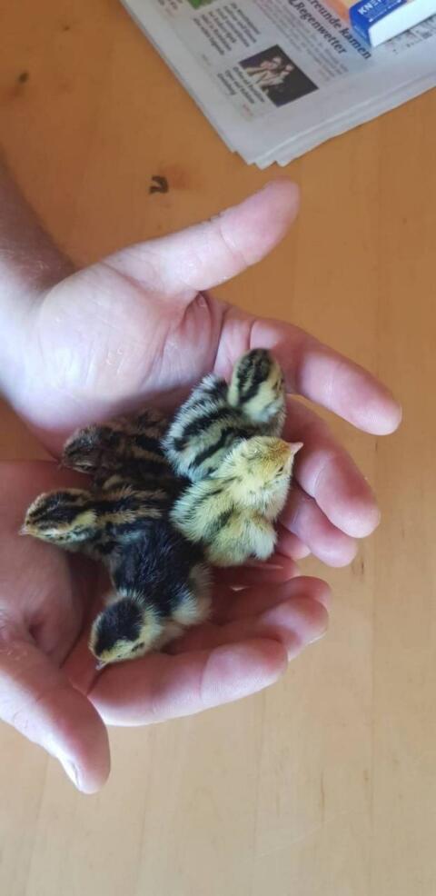 Wir bieten Wachtelbrut an. Sie sagen uns, wie viele Sie wollen, dann brüten wir sie aus. Schlupfrate lag bei 17/18 Eiern, also ca. 95 %. Nach 16-17 Tagen können Sie