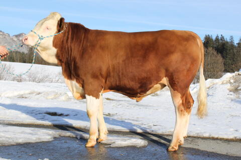 Hokuspokus Fleckviehstier, gekört, sehr ruhig und brav im Umgang und sehr guter Springer. Alm- und weidetauglich. Aufzuchtbetrieb Maria und Johann Adelsberger. Rinde