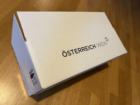 Autokarton liegend für 6 Flaschen 0, 75 l, diverse Flaschenformate, nicht für Burgunder-Flaschen geeignet. Mit Logo „ÖSTERREICH WEIN“. Verpackung / Aufbewahrung Kiste