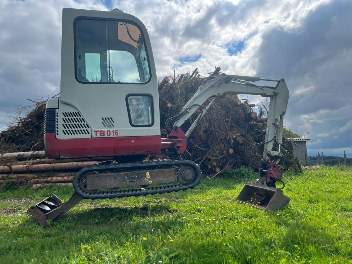 Verkaufe Minibagger Takeuchi TB016, Bj. 2004, 4.669 Bstd. Ausstattung: Geschlossene Fahrerkabine mit Heizung und Radio, mechanischer Schnellwechsler mit Lasthaken, h