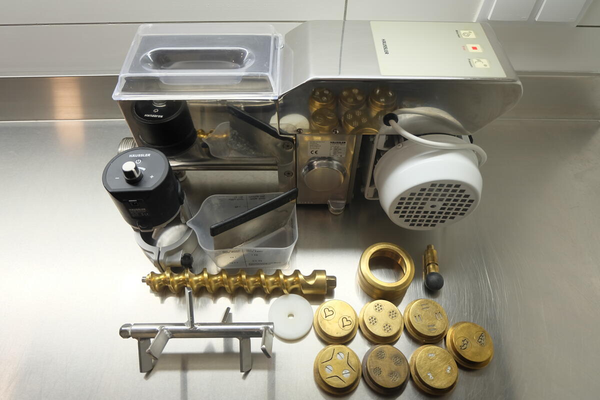 Nudelmaschine PN 100, Nudelschneider, Matritzenformen, Matrize Nr. 1 - Capellini (Suppennudel) 0, 8 mm, Matrize Nr. 501 - Weihnachtsmotive, Matrize Nr. 49 a - Fusilli